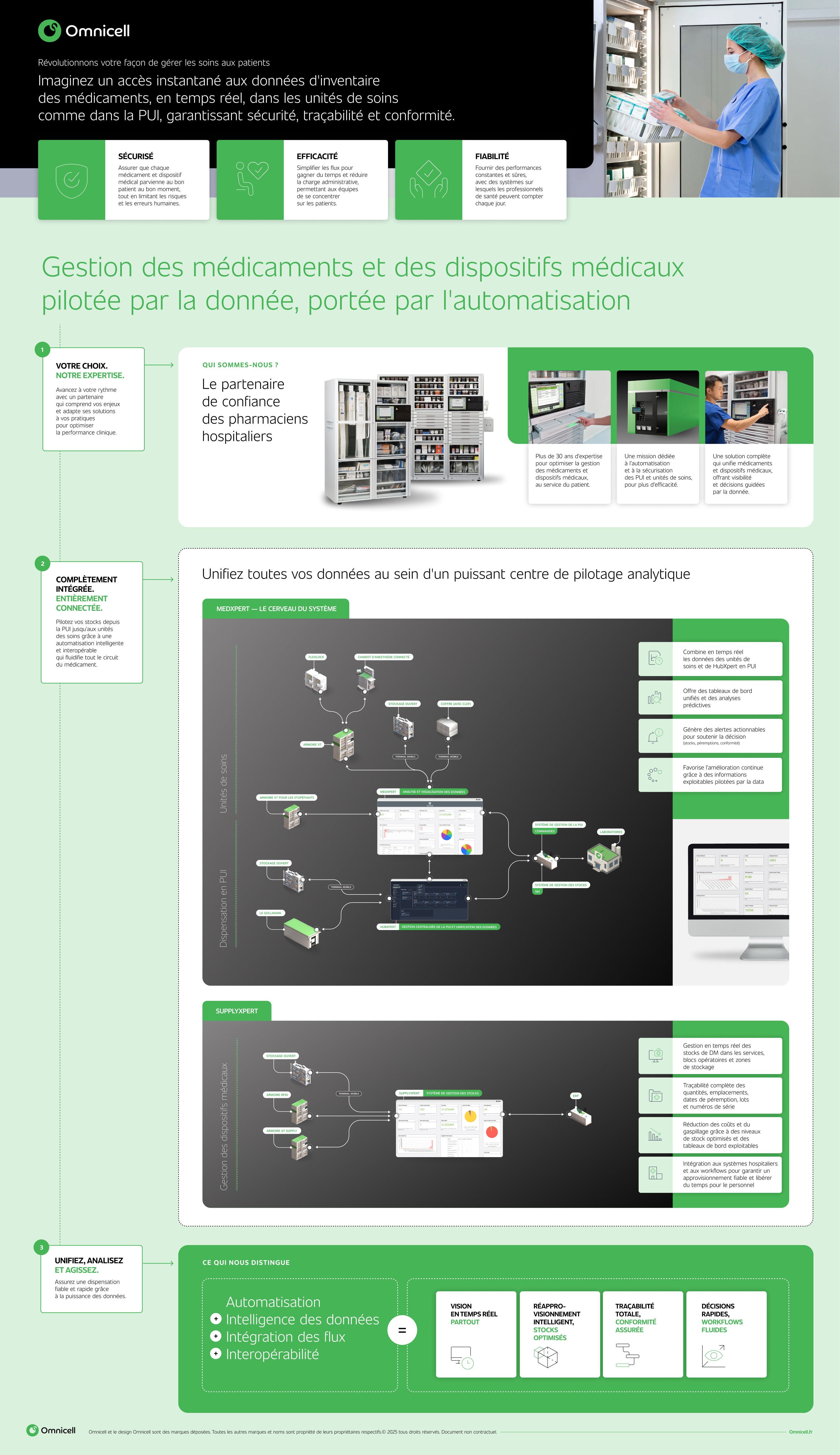 Découvrez comment Omnicell assure une gestion fluide des médicaments et des dispositifs médicaux dans les hôpitaux, en combinant l'automatisation intelligente et interopérable et les flux de travail dans une infographie claire.
